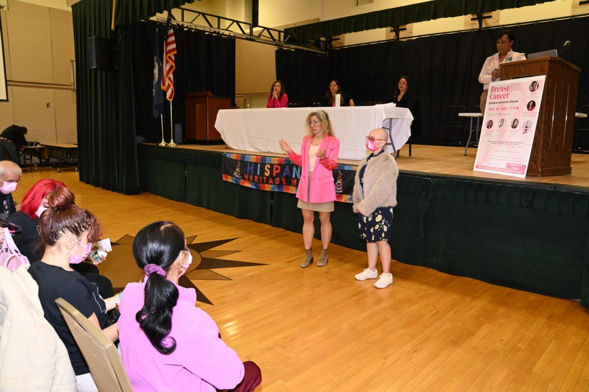 Luciendo una mascarilla de color rosa, María se levanta de su asiento y camina al escenario. La recibe un grupo de abogadas que han llegado a Long Island para brindar información vital a mujeres latinas en medio de las celebraciones del Mes de la Herencia Hispana.